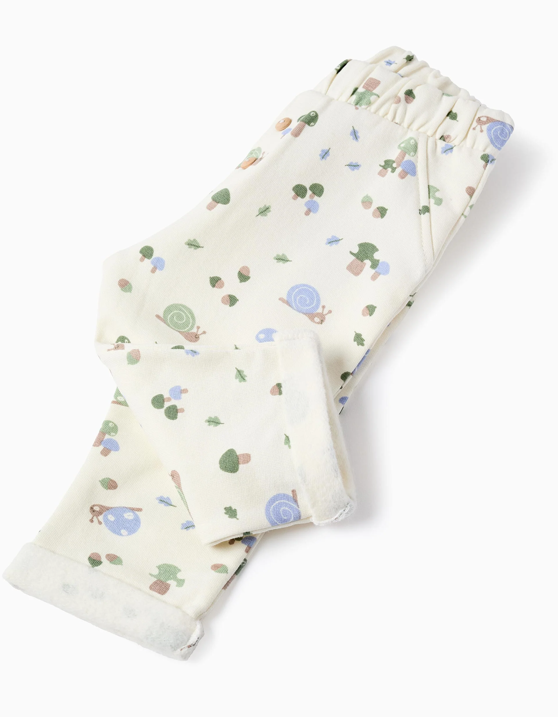 Beige jogger trousers with snail and mushroom motif for newborns. brushed interior for greater thermal comfort. Comfortable elasticated waistband. Decorative buttons. A warm and fun option!