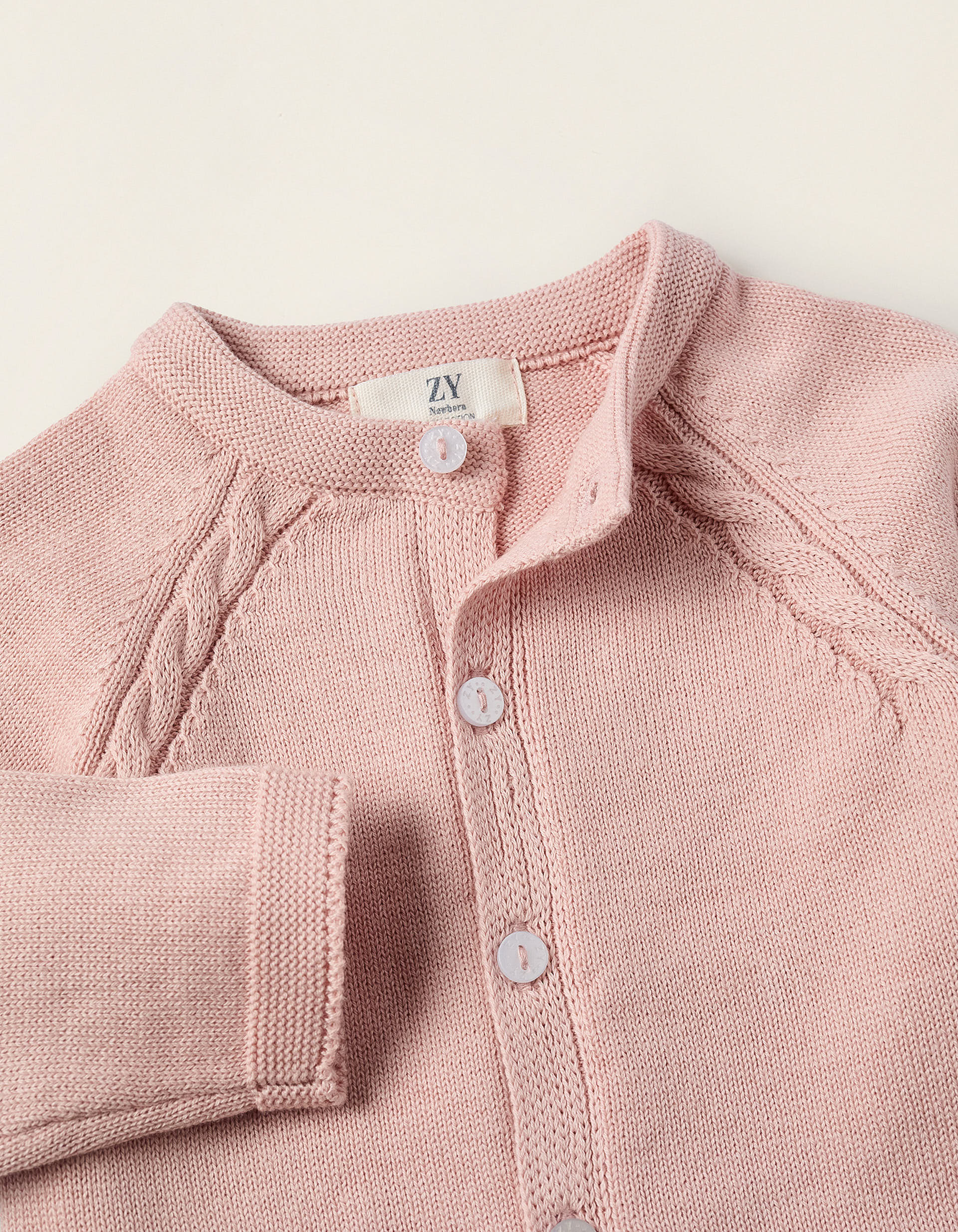 Pink knitted cardigan for newborn girls, 100% cotton. Raglan sleeves with braided knit details on the shoulders. Contrasting mother-of-pearl buttons. A wardrobe essential.