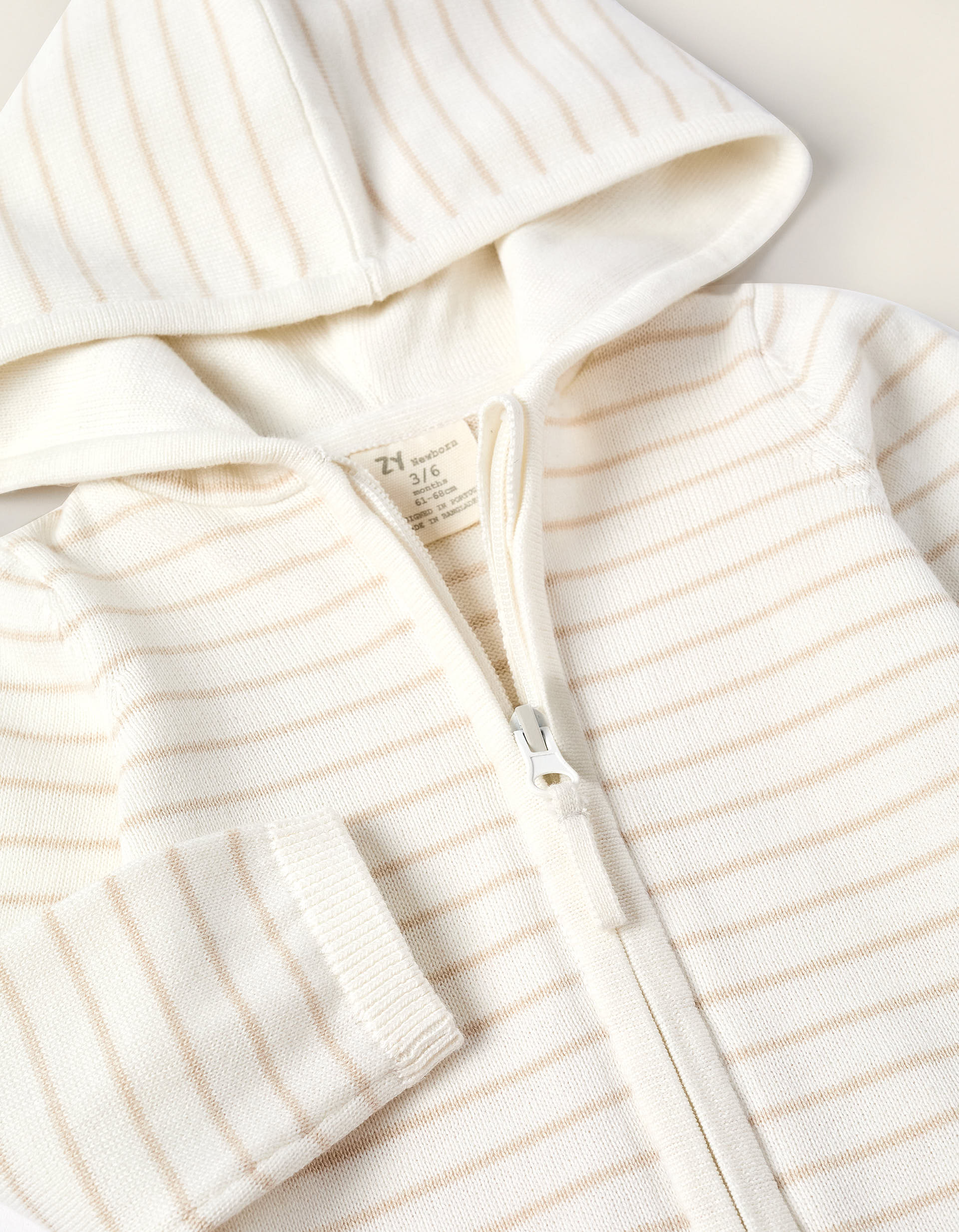 White knitted cardigan for newborns, 100% cotton. Beige striped pattern. Easily fastens with a zip, with a protective flap on the neck. Ribbed cuffs for a perfect fit. A wardrobe essential!